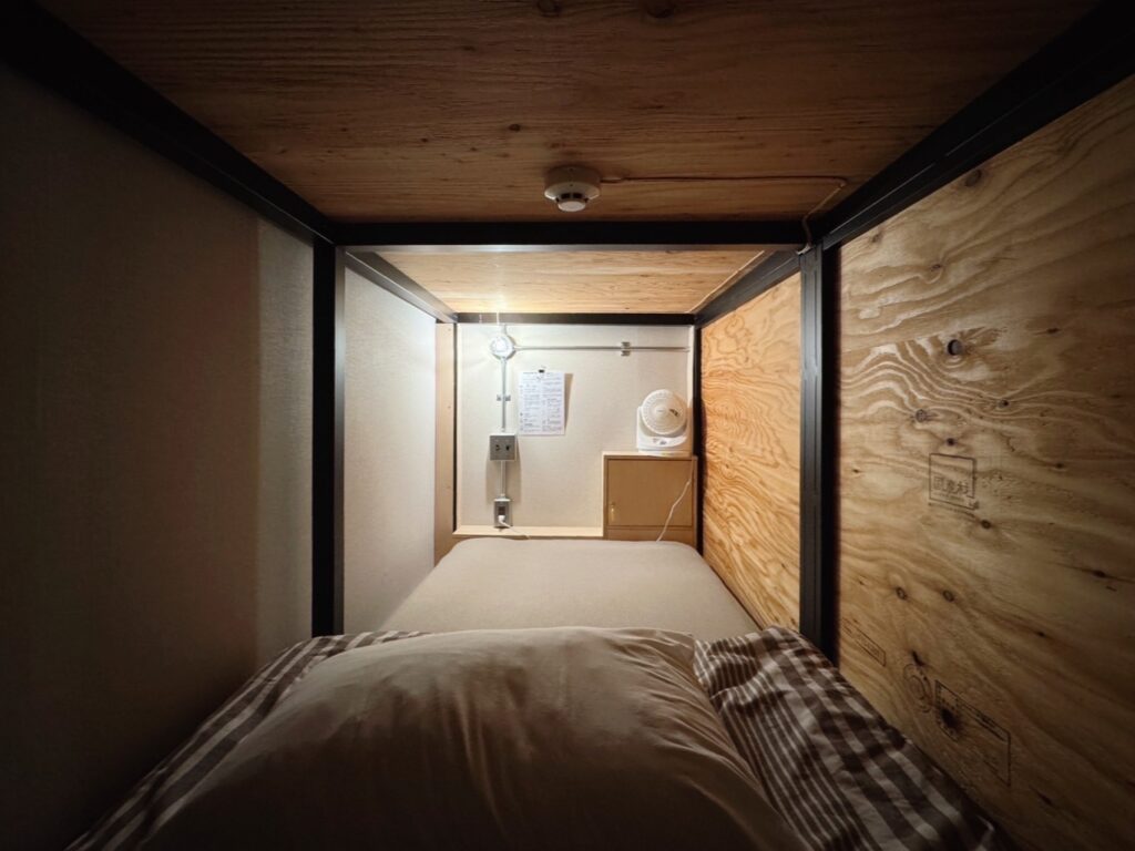 写真のようなカプセルホテル風の寝床が並ぶスタイルです。